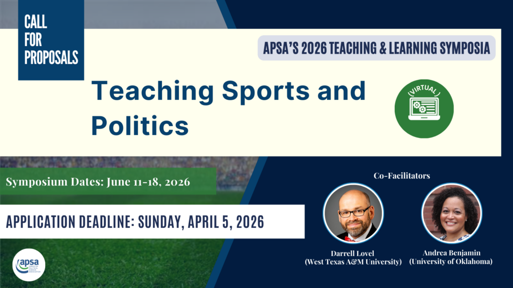 Call for Proposals | Teaching Sports and Politics | Start Your Application Here |  Dates: June 11-18, 2026  Application deadline: April 5, 2026 The American Political Science Association’s (APSA) Teaching and Learning program is pleased to announce a call for proposals for a small cohort of political scientists to participate in a virtual teaching and learning symposium that will meet on Zoom between…
