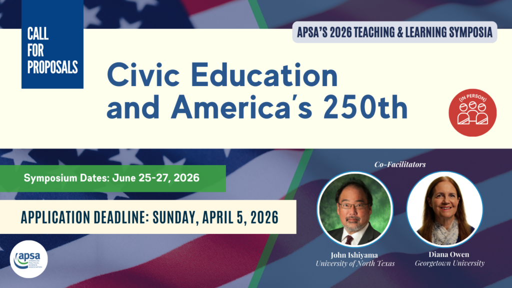 Call for Proposals | Civic Education and America’s 250th | Start Your Application Here | APSA, Washington, D.C., June 22-26, 2026 Application Deadline: April 5, 2026 The American Political Science Association’s (APSA) Teaching and Learning Program is pleased to announce a call for proposals for approximately 15 to 20 political science educators and scholars to…