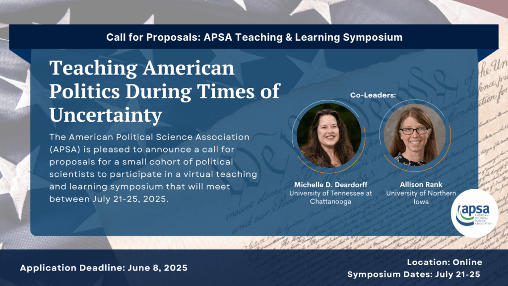 Call for proposals | APSA Virtual Teaching & Learning Symposium | Application Deadline: June 8, 2025 The American Political Science Association’s (APSA) Teaching and Learning Program is pleased to announce a call for proposals for a small cohort of political scientists to participate in a virtual teaching and learning symposium that will meet on Zoom…