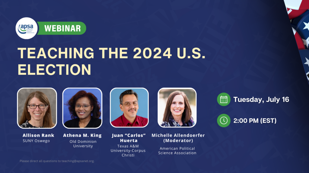 July 16, 2024 | How are political science educators bringing the 2024 U.S. election into their classrooms? What assignments or activities should political science educators use to help undergraduates understand the 2024 U.S. election? What tools can faculty use to address campaign and election mis- and disinformation? Please watch the webinar recording above and check…
