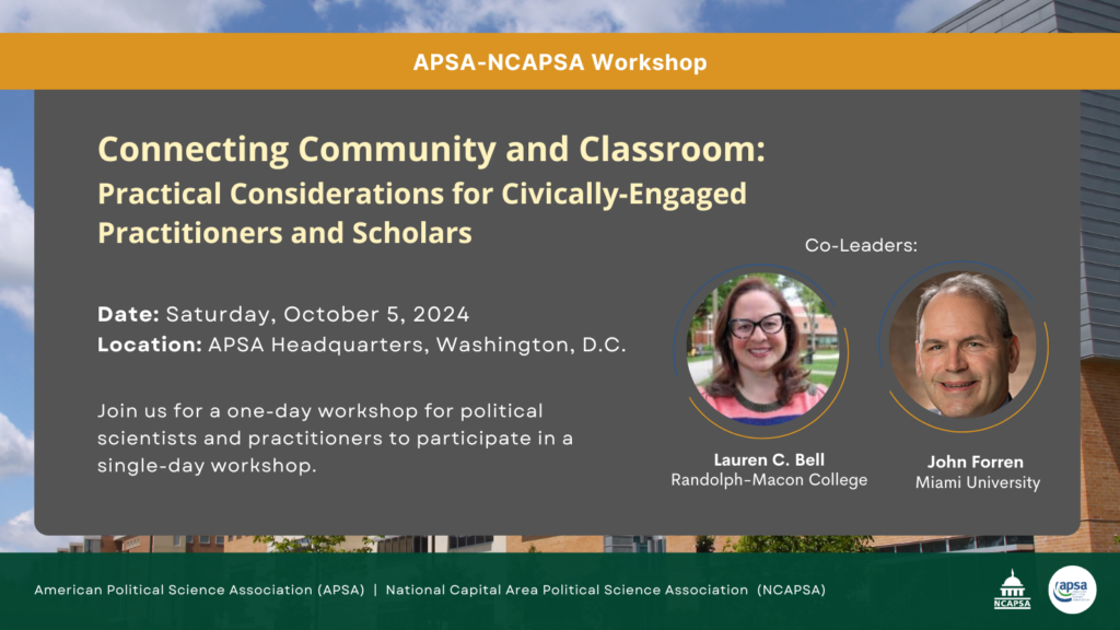 October 5, 2024 | Register Here | View Program Schedule The American Political Science Association (APSA) and The National Capital Area Political Science Association (NCAPSA) are thrilled to invite political scientists and practitioners to a single-day workshop, Connecting Community and Classroom: Practical Considerations for Civically-Engaged Practitioners and Scholars, on Saturday, October 5, 2024, at APSA’s…