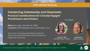 The American Political Science Association (APSA) and The National Capital Area Political Science Association (NCAPSA) are thrilled to invite political scientists and practitioners to a single-day workshop, Connecting Community and …