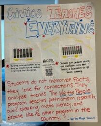 A poster entitled “Civics Teaches Everything” (Figure 2 above) emphasized how the communication skills students built through We the People can translate to “all fields and disciplines.” This group identified how problem solving and teamwork skills create a “foundation for future learning.” They expressed the importance of the program’s active learning strategies to advocate for its implementation in schools. This emphasis reflects the findings of prior research, including CERL’s studies, that establishes a positive relationship between active pedagogies and civic learning outcomes (Owen and Irion-Groth 2024; Kozanitis and Nenciovici 2023).