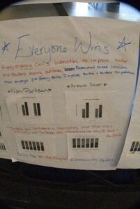 We began the session by presenting CERL’s research findings on the impact of CEAS on teachers and students who had participated in the program. We provided workshop participants with a [4] that included data visualizations and a summary of key points of our presentation. We asked them to take a deeper look at the research and identify the data that would be most useful if they were to advocate for using the We the People curriculum in their own classrooms, schools, districts, or states. Working in groups, the educators combined the data presented by CERL with their personal reflections to create a poster. Groups began by identifying their target audience–parents, teachers, school administrators, district leaders, or state policymakers (activity instructions[5]). Next, groups determined the goal of their poster. Were they trying to inform parents of the program’s success? To recruit other educators to participate in the study? To convince administrators to adopt We the People as a district wide curriculum? Or were they trying to advocate for policies that provide funding for civic education at the state-level? The data visualizations, included in the handout, could be customized, cut, and pasted onto their poster. Since qualitative evidence is essential for data storytelling, we asked groups to reflect on their experiences with CEAS and include a quote from their discussion on their poster.