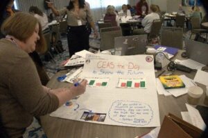 It can be difficult for researchers to fully understand best practices for data use by practitioners, and CERL is certainly no exception. We came to recognize that comprehending the composition, needs, and goals of the civic educators we want to reach is vital to the success of our work. When disseminating our research, it is imperative that we ask: Who is using the data? For what purpose? In what context? And with what desired outcome? Fortunately, research specialists on the CERL team have elementary and secondary school teaching experience. We brainstormed about ways to get teachers involved in telling the story of our data and created a professional learning session entitled Campaigning for CEAS: Using Data & Design to Create a Compelling Story[1] to actively engage educators in data storytelling. We implemented this activity at a workshop convened by the Center for Civic Education[2] for the We the People: Civics that Empowers All Students[3] (CEAS) program, an initiative that supports effective educator development through the Center’s flagship We the People curriculum. The workshop was held in Los Angeles in March 2025. CERL is the independent evaluator of the CEAS program which was funded by a grant from the U.S. Department of Education. This essay provides an overview of the activity we used to engage teachers with the data, as well as resources.