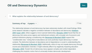 For instance, I used Elicit to explore the literature on the relationship between oil and democracy. I prompted the tool with “What explains the relationship between oil and democracy?” as shown in Figure 1. The summary it generated highlighted key themes and trends, offering a useful starting point. However, I quickly noticed the absence of foundational works like Ross (2001), a key source in this field. This gap illustrates why human oversight is crucial because even specialized AI tools may not cover all relevant literature comprehensively.