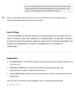 Another valuable use of AI is in generating initial bibliographies. While AI-generated bibliographies require verification for accuracy and relevance, they can provide a solid starting point for literature searches. I have found AI tools particularly effective for keyword identification. Students often struggle to pinpoint the right keywords, and AI tools can generate lists of synonyms and related terms. For example, when I asked ChatGPT to create a search string for factors explaining the relationship between oil and democracy using Boolean terms within Web of Science, it not only provided alternative keywords but also explained the rationale behind the search string (see Figure 2).